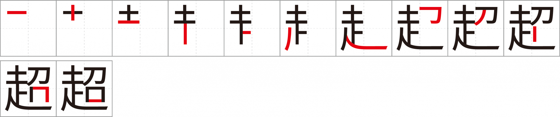 基準や限界をこえることや、すばらしいことを意味する文字です。『ドラゴンボール』の世界では、サイヤ人の戦闘力を超えた戦士のことを「超サイヤ人」と呼びますが、そこにもこの文字が使われています。これだけではなく、日本では名詞、動詞、形容詞などの前にこの文字をつけて、表現を誇張する使い方をします。