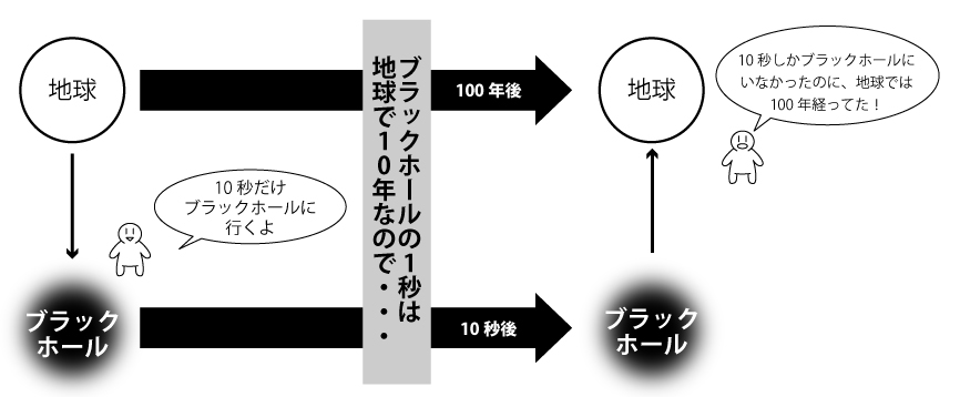 たとえば、実現できるかはさておき、地球からブラックホールに行くとしましょう。10秒だけブラックホールにいて、戻ってくる。戻ってきたとき、地球上では10秒よりもはるかに長い時間が経っており、本人からすると未来に移動しているわけです。