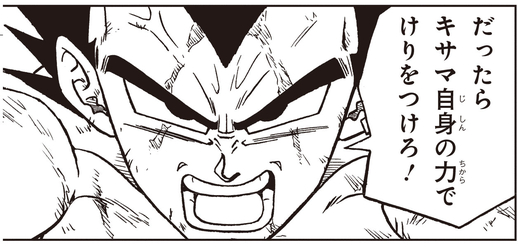 ベジータはグラノラに仙豆を渡して、自分自身の力で因縁にけりをつけるよう喝を入れます!
