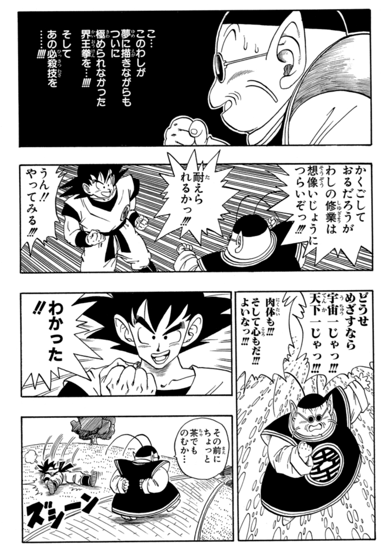 読み進んでいくうちに思い出したけれど、悟空って勝手に1人で強くなっていったわけではない。孫悟飯(じいちゃん)、亀仙人、かりん様、神様&ミスターポポ、界王様、ビルス&ウイス……。さまざまな師匠たちのもとで修業をしていたのだった。
