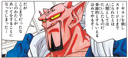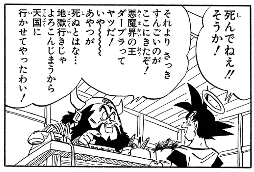 魔人ブウに食べられた後、天界の閻魔大王のもとへ送られたダーブラ。地獄行きだと喜んでしまうので、天国に行かされたようだ。