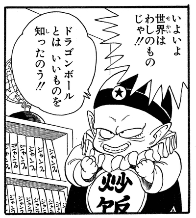 神龍を呼び出して世界征服の願いを叶えようとしたが、突如乱入したウーロンに先に願いを叶えられてしまう。