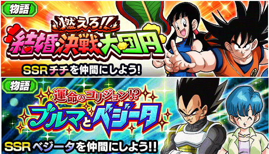 「燃えろ!! 結婚・決戦・大団円」「運命のコリジョン!?ブルマとベジータ」がそれぞれ開催中! イベント挑戦時、チームに編成される指定されたカテゴリのキャラクターが多いほどボスから獲得できる報酬の追加ドロップ率がUP!! また、それぞれのイベントで仲間にできるSSRキャラクターは後日ドッカン覚醒が可能だ! 報酬の追加ドロップ率UPを狙って、キャラクターやサポートメモリーをGETしよう‼