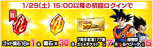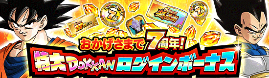 「おかげさまで7周年!特大ドッカンログインボーナス 」が開催中! 期間中の初回ログインで「龍石」や「77連ガシャチケット」などの豪華報酬に加え、【闘志に満ちた挑戦】孫悟空&ベジータが仲間になるぞ! さらに、毎日のログインボーナスで「龍石」や「7周年コイン」、「記念ガシャチケット」と豪華報酬が獲得できるぞ! 毎日欠かさずログインして豪華報酬をGETしよう!