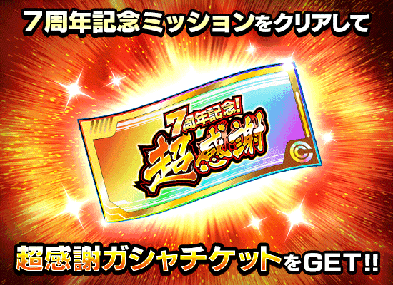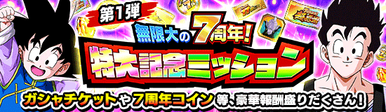 「無限大の7周年!特大記念ミッション」が開催中! イベントミッションクリアで「77連ガシャチケット」や「龍石」などの豪華報酬がGETできるぞ! さらに、後日開催予定のガシャで使用可能な「超感謝ガシャチケット」や期間中の初回ログインで仲間にできる【闘志に満ちた挑戦】孫悟空&ベジータもミッションの報酬としても登場するぞ! たくさん遊んで豪華報酬を余すことなくGETしよう!