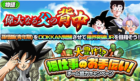 孫悟飯(青年期)が仲間できる新たな物語イベント「偉大なる父の背中」や、孫悟空とベジータ専用のスキル玉を獲得できる回数制限イベント「高まる気迫!ライバル競演」、豪華報酬をGETできるチーム協力キャンペーン「大豊作!? 畑仕事のお手伝い!」などイベントが盛りだくさん‼ 7周年を記念した超絶豪華なキャンペーンをドッカンと遊びつくそう!!