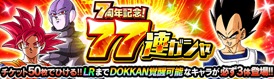 「7周年記念!77連ガシャ」が開催中! このガシャでは合計77体のキャラクターが一気に仲間になるぞ! 「77連ガシャチケット」と「龍石」で引ける連続ガシャがあり、それぞれ1回限定で引くことが可能だ! LRまでドッカン覚醒可能なSSRキャラクターが必ず登場