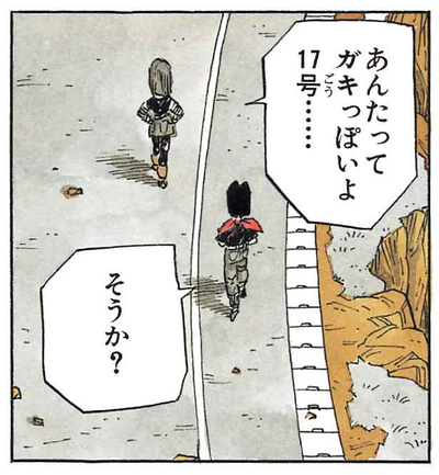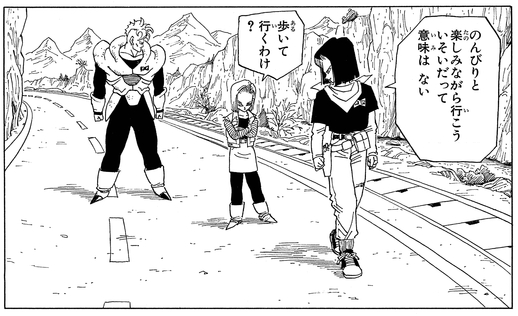 飛んでいけばすぐに悟空の元へたどり着くのに、自動車を奪ってのんびりと居場所を探す旅を楽しんでいた。17号にとってはそのムダが楽しいようだが、18号から見ると「ガキっぽい」ようだ。