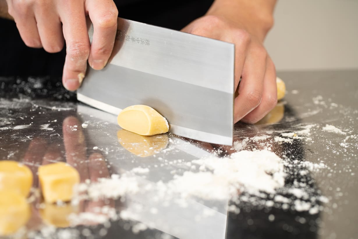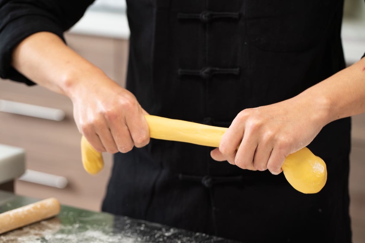 まず皮の部分は、薄力粉と卵だけの生地だと卵のコクは感じられるものの、卵に火を入れた時にモソっとした食感が出てしまう。でも、ここに上新粉の生地を加えることで滑らかさがプラスされます。