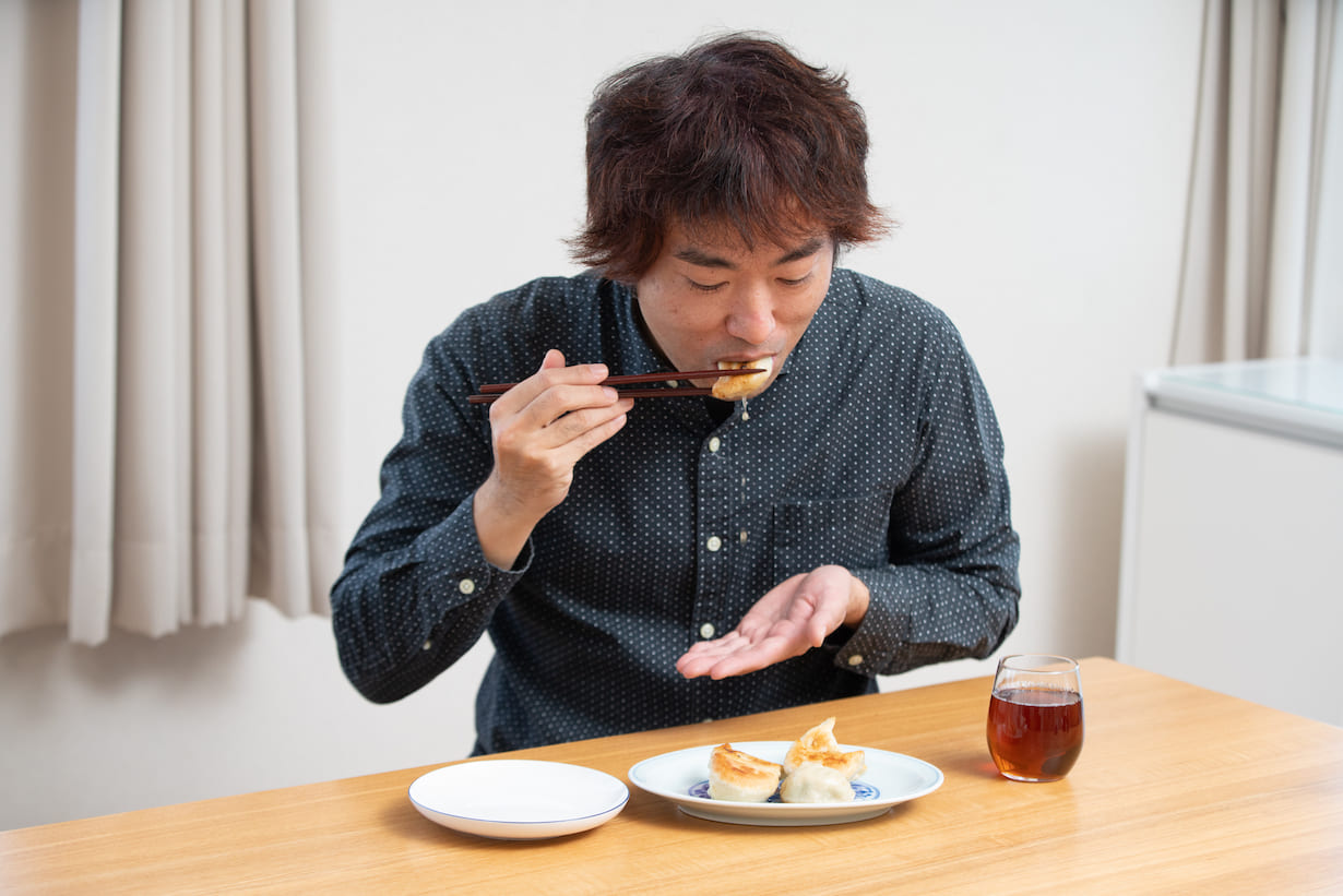 タネの部分も、もち米が入ると印象が大きく変わってきますね。普通の餃子と違い、ミッチリと詰まった食感でご飯を食べていることが伝わります。