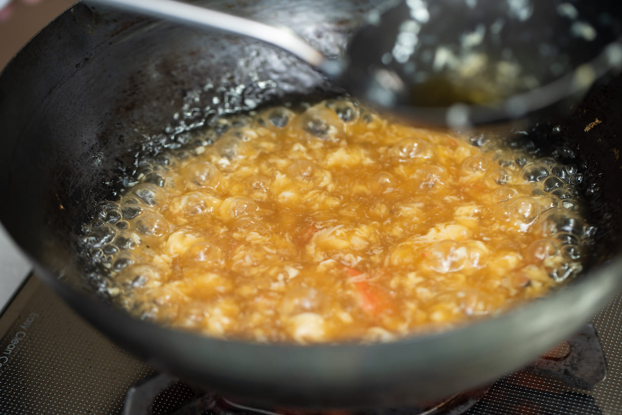 波!!!!!!! まだ料理の途中ですってば。ここで具と溶き卵入りの餡を作って……。