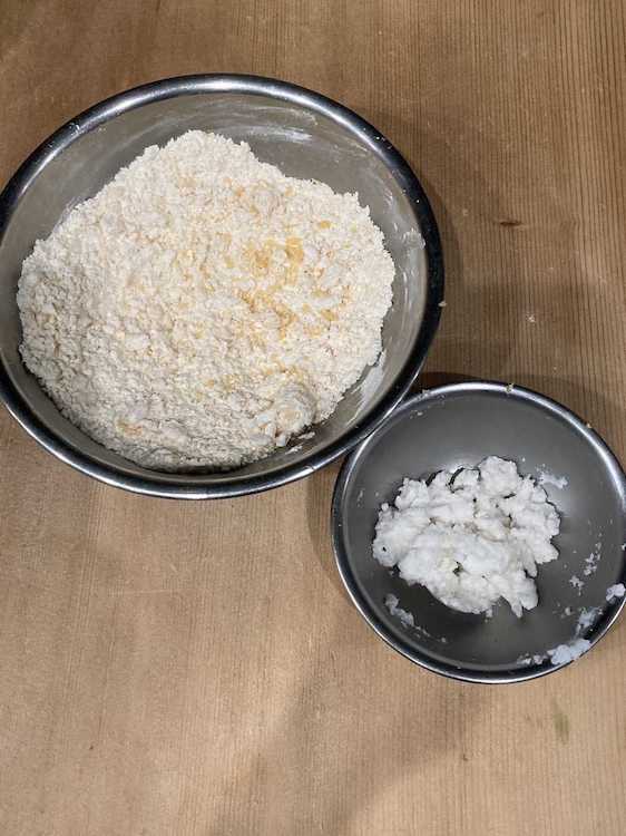 1:生地1と生地2をそれぞれよく捏ねて、合わせてさらに捏ねて、ラップをしてしばらく寝かせる。