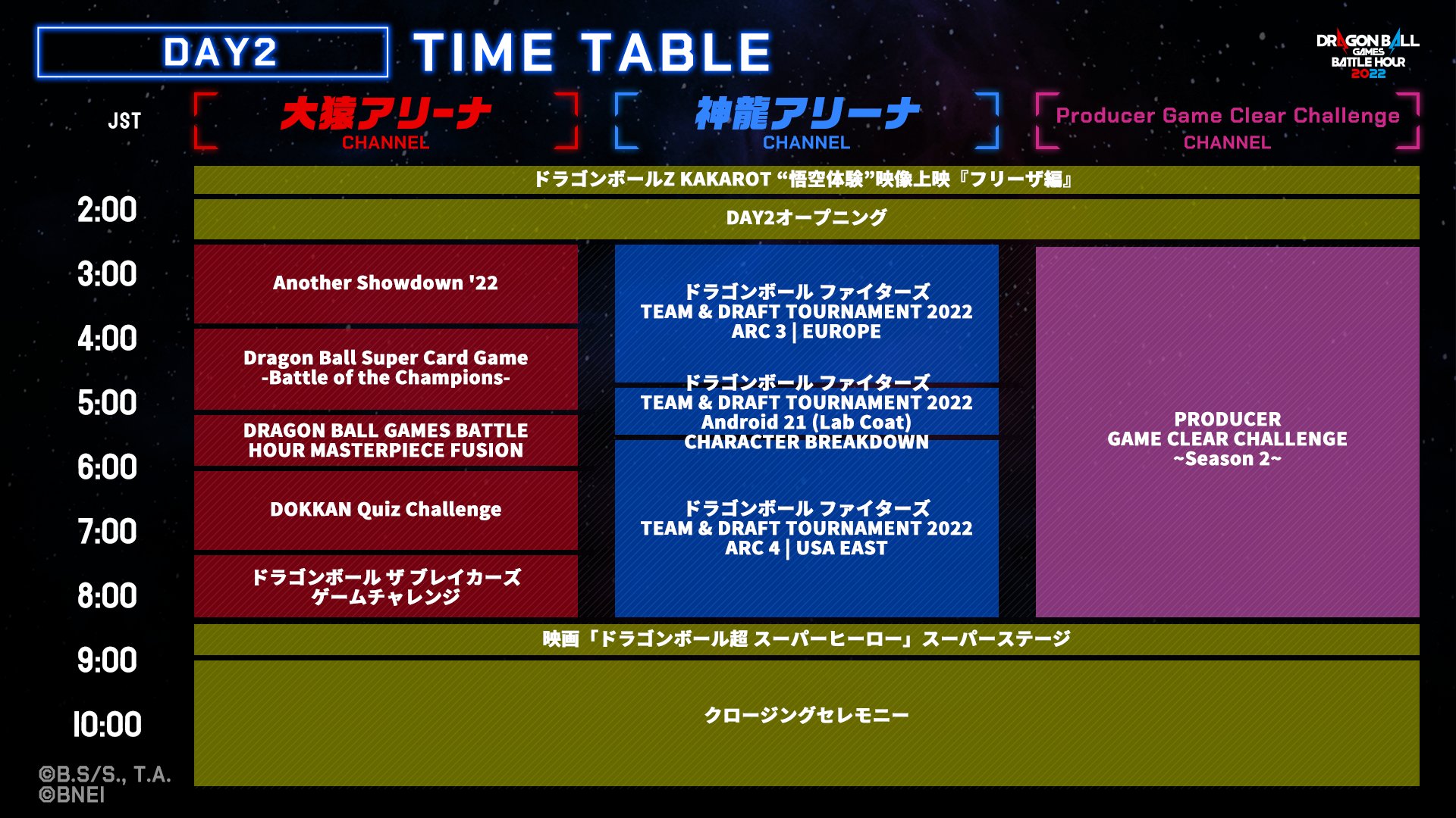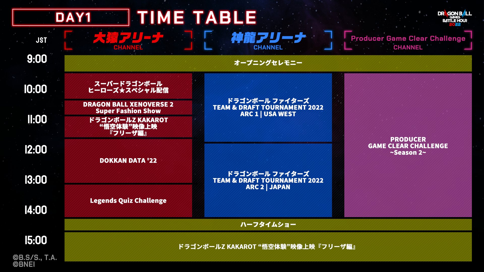 3つのチャンネルが並行して異なる配信を行うぞ。「大猿アリーナ」では、「SDBHスペシャルゴッドチーム決定戦2022」をはじめ、特別映像の上映や参加型のクイズ大会など、多彩な企画を実施! 「神龍アリーナ」では、地域を越えたチーム対抗戦の熱いバトル。「PRODUCER GAME CLEAR CHALLENGE」では、歴代のゲームプロデューサーが集結して、PS2「ドラゴンボールZ2」のクリアにチャレンジ!