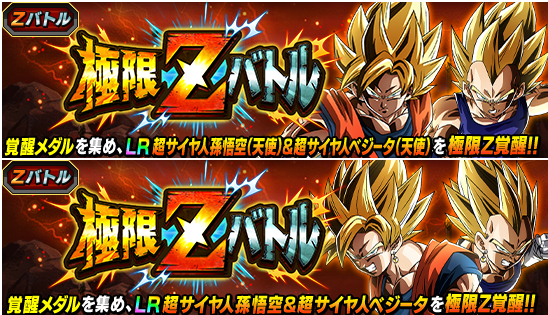新たなる極限Zバトルが開催! 本イベントでは2体のLRキャラクターの極限Z覚醒が可能だ! 覚醒メダルを集めて【ふたつの力の融合】超サイヤ人孫悟空(天使)&超サイヤ人ベジータ(天使)、【合体する超パワー】超サイヤ人孫悟空&超サイヤ人ベジータの極限Z覚醒を目指そう‼