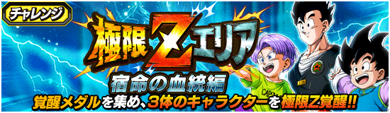 極限Zエリア「宿命の血統編」が開催! 物語イベントで仲間にできる3体のキャラクターが極限Z覚醒可能になったぞ! LRキャラクター【夢いっぱいの未来】孫悟飯(青年期)&孫悟天(幼年期)&トランクス(幼年期)の極限Z覚醒にも注目だ! 特定のキャラクターのみが挑戦できる極限Zエリアで覚醒メダルを集めよう!